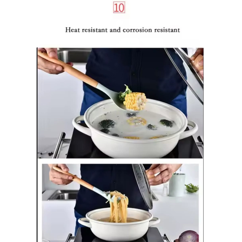 3.Versátil y multifuncional:Este kit de herramientas de cocina es perfecto para una variedad de tareas de cocina.Desde voltear panqueques hasta revolver sopas, estos utensilios están diseñados para manejar cada escenario de cocina, haciendo que sus aventuras culinarias sean más cómodas.