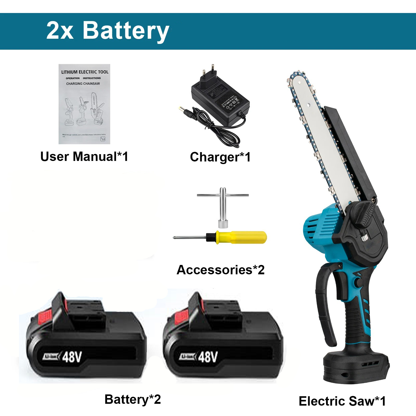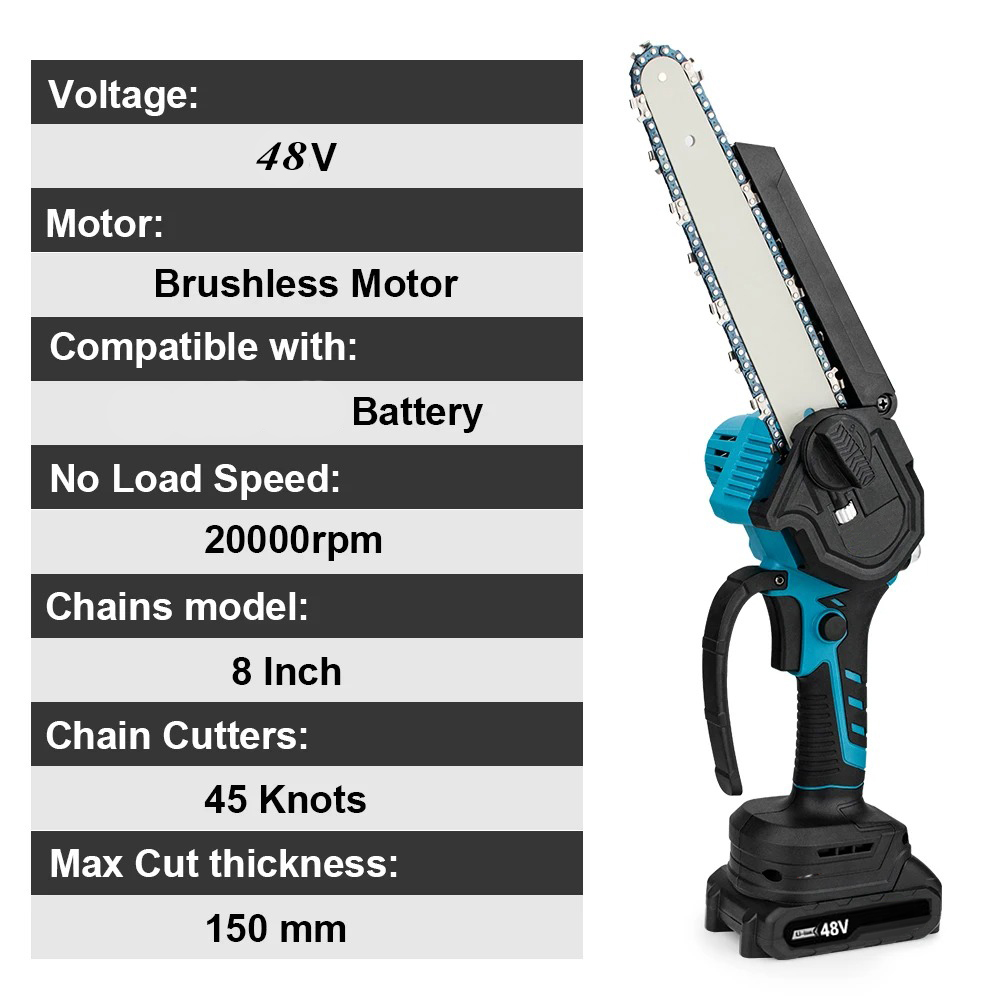 Funciona con una batería de 48 V de gran capacidad, con protección contra sobrecarga y carga rápida. Su motor de cobre ofrece una salida fuerte y estable, mientras que la cadena de acero al carbono, afilada y resistente al desgaste, garantiza cortes suaves y precisos.