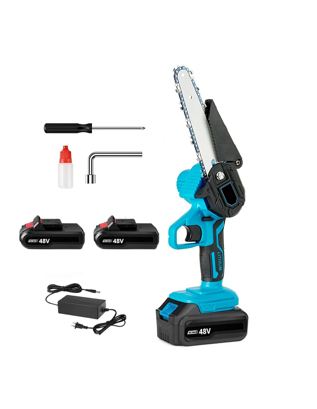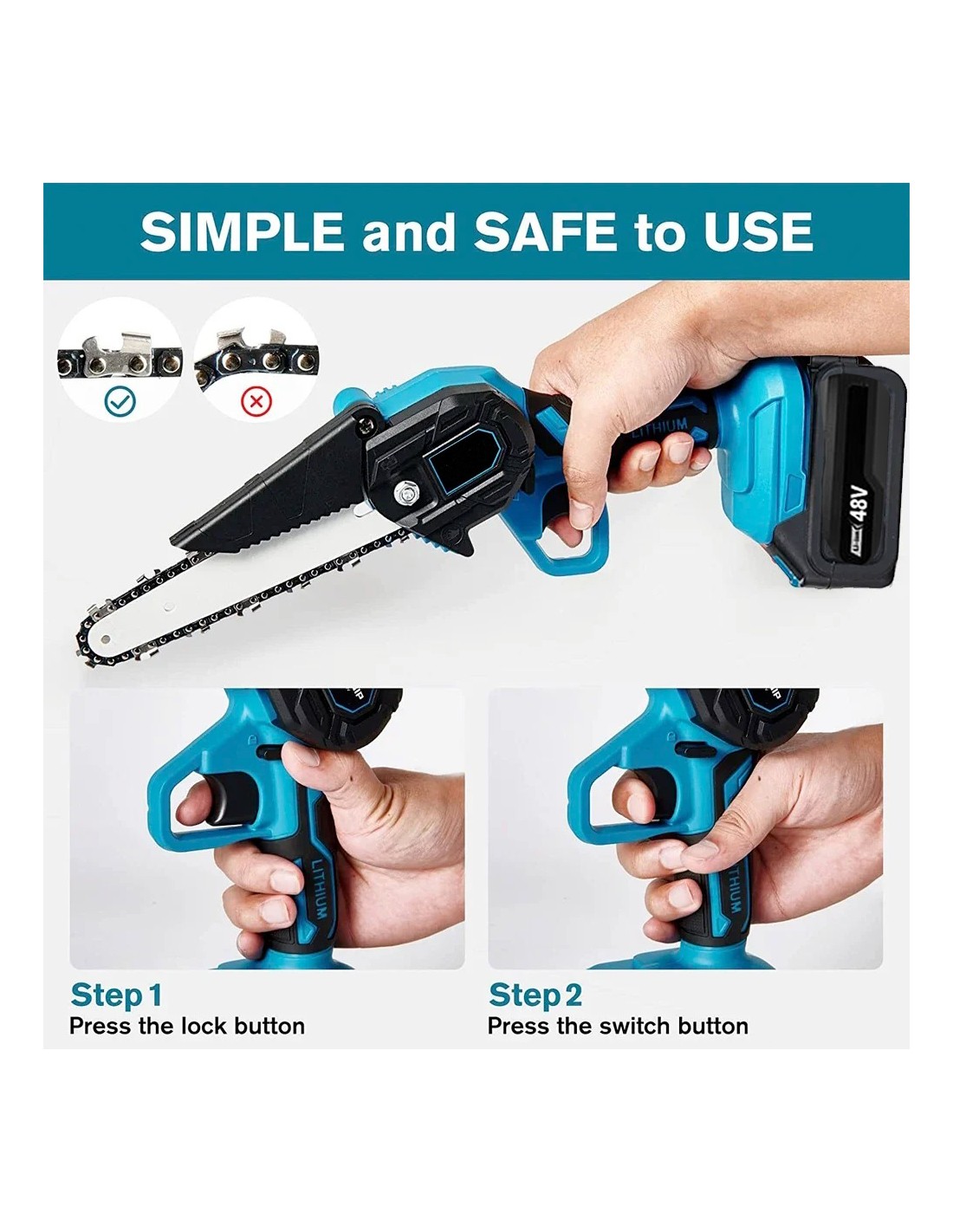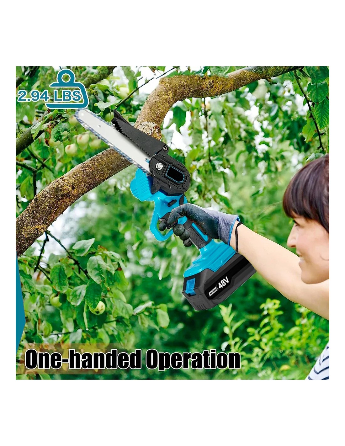 Funciona con una batería de 48 V de gran capacidad, con protección contra sobrecarga y carga rápida. Su motor de cobre ofrece una salida fuerte y estable, mientras que la cadena de acero al carbono, afilada y resistente al desgaste, garantiza cortes suaves y precisos.